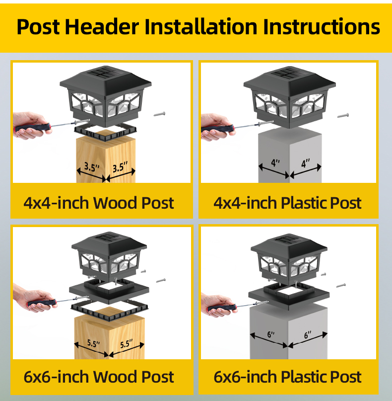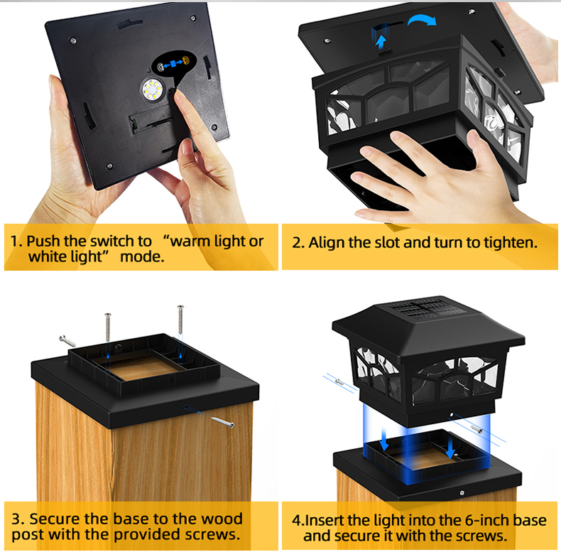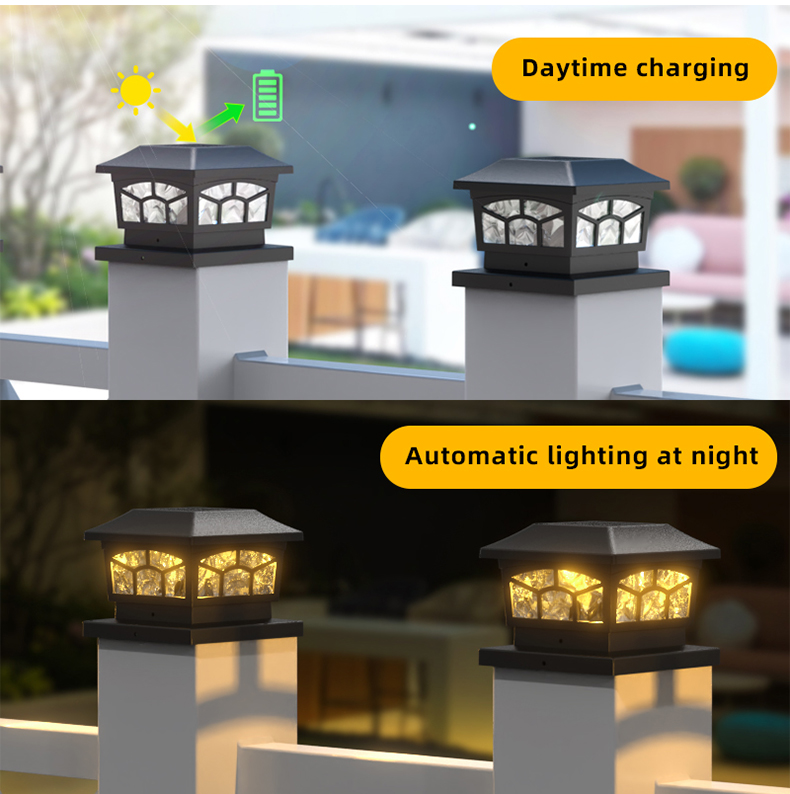Dual Mode Solar Post Cap Light Solar Garden Light ад Landsign мае інтэлектуальную святлоадчувальную сістэму, вонкавую моцную воданепранікальнасць і просты ў ўстаноўцы, падыходзіць для ўпрыгожвання двара, саду і г.д. Два рэжыму асвятлення, вы можаце свабодна выбіраць сваё любімае асвятленне. Двухрэжымны сонечны ліхтар Solar Garden Light можна ўсталяваць на сцяне з дапамогай шруб, якія ўваходзяць у камплект, за лічаныя секунды, без кабеля або правадоў.